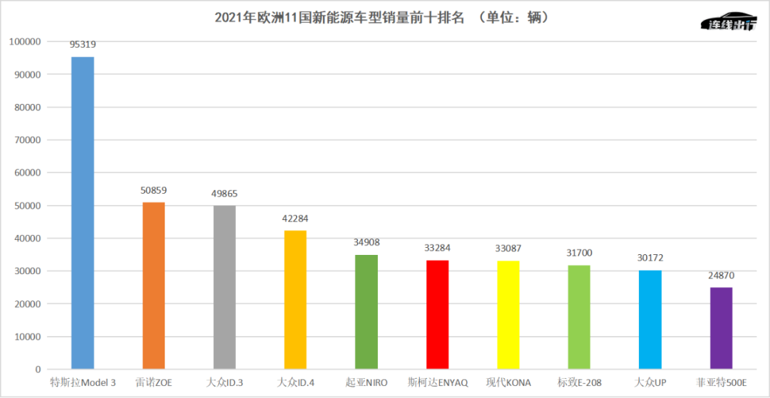 车型销量方面,特斯拉Model 3以95319辆位居第一,雷诺ZOE、大众ID.3和ID.4分别以50859辆、49865辆和42284辆分据二至四位,起亚NIRO、现代KONA和标致E-208位居其后。