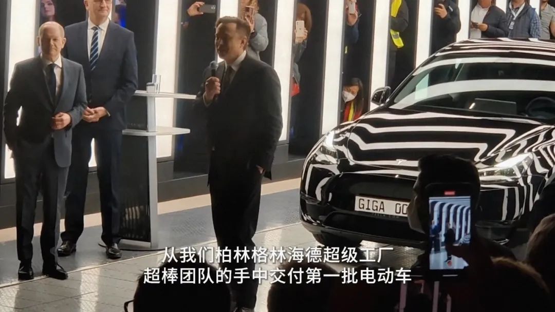 与马斯克一起到场的,还有德国总理奥拉夫·朔尔茨和经济部长罗伯特·哈贝克,在其二人的见证和全场的掌声中,马斯克亲自将首批30辆Model Y一一交付给了在场的用户。