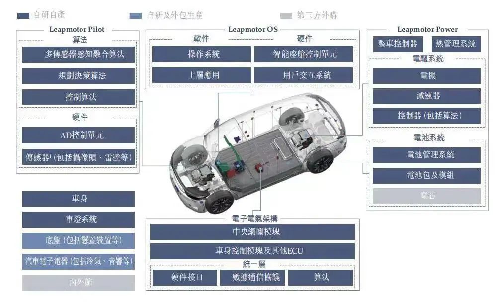 零跑汽车宣称全域自研,不同于其他车企或专注于芯片、或专注于智能驾驶,零跑上来就要做所有核心系统和电子部件的自主研发设计与生产制造。零跑除了电芯、底盘、汽车电子电器、内外饰为自研及外包生产外,所有其他零部件包括车灯都自产自研。