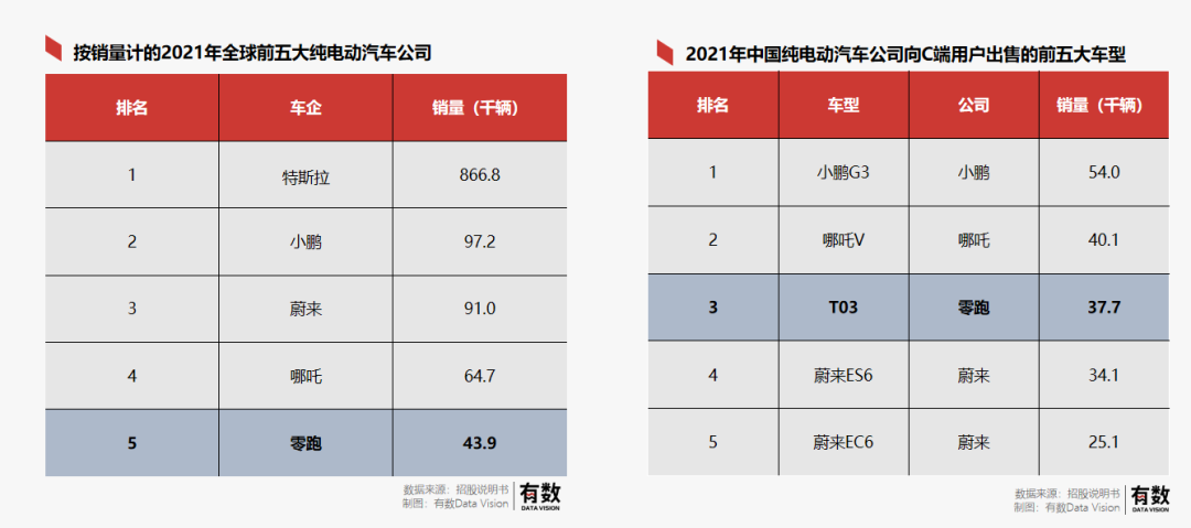 零跑的主力车型是微型车T03,截止2021年底总计交付约4.6万辆,也就是类似五菱宏光mini和欧拉黑猫那种车型,定价在7万附近。靠着这款车的大卖,零跑汽车在数量上冲进了全球纯电汽车公司的前五名,如果单论T03向C端用户的销售量,在中国甚至能排到第三名。