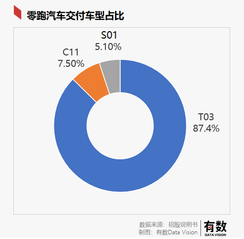 虽说零跑已开始交付轿跑S01和SUV系列的C11,但占比非常小,分别交付2700余辆和4000辆,出货主力还是T03。