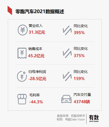 就招股书中的数据显示, 2021年全年,零跑汽车合计交付43748辆电动汽车,同比增长超400%,堪称造车新势力中增速最快。毛利率从2019年的-95.7%增长到最新的-44.3%,活脱脱一幅造车新势力的又一员猛将诞生的画面感。