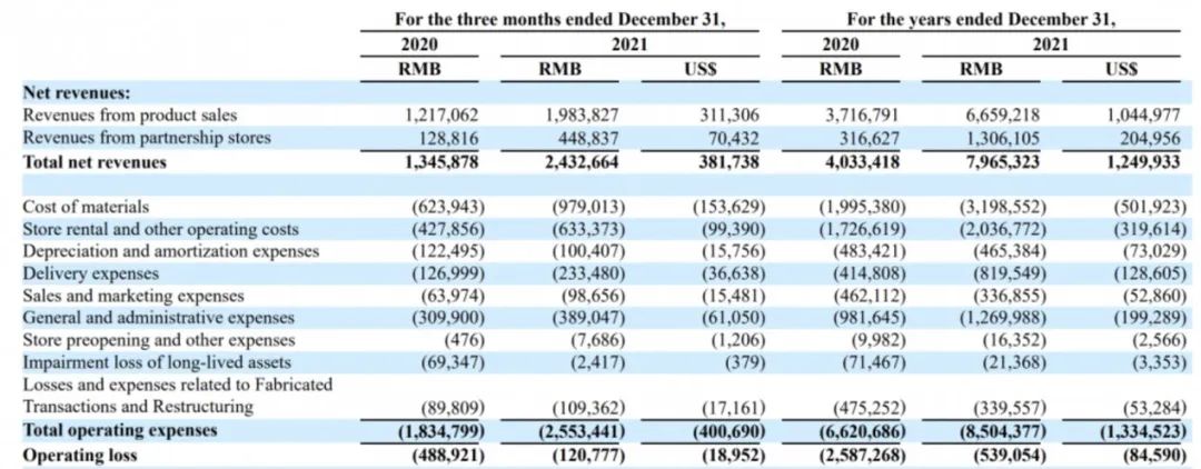 全国超过6000家门店,年总净收入与Q4总净收入迎来同比高达97.5%、80.7%的增长,两项口径下的亏损均较上年减少,瑞幸距离盈利仅“一步之遥”。