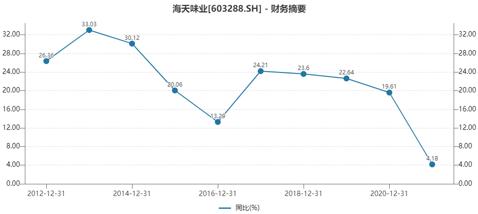 海天味业2014年上市,上市当年至2020年的7年里,除2016年外,公司营业收入增速均超过15%,扣非后归属于上市公司股东的净利润增速均超过20%。2021年匀速增长神话破灭。