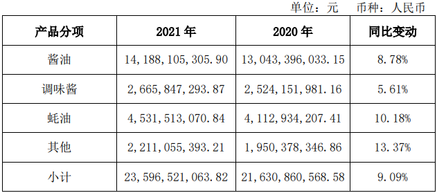海天味业有着酱油、蚝油、调味酱三大核心产品。年报显示,酱油实现营收141.88亿元,增长8.78%;蚝油实现营收45.32亿元,增长10.18%;调味酱实现营收26.66亿元,增长5.61%。