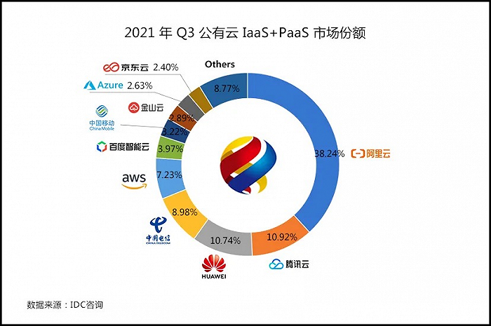 参考国际市场研究机构IDC发布的《中国公有云服务市场(2021第三季度)跟踪报告》,备受关注的公有云IaaS+PaaS市场份额上,阿里云、腾讯云、华为云占据六成份额。