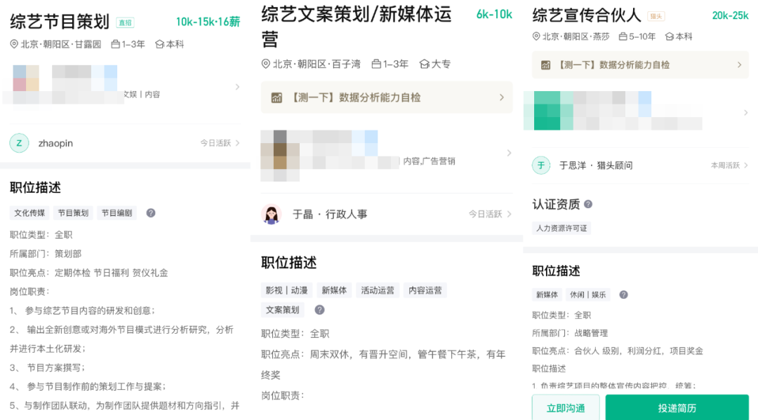不过,嘴上说“躺平”的木木一直都没放弃寻觅机会,几个月里她积极向大小综艺项目投简历、走内推,可往往收到的都是“我们还在招商中”这类回复。要知道,像综艺导演这种内容型岗位以前压根不用管招商,如今项目方主动告知导演们招商状况,本质上是在暗示:我们这项目八字没一撇呢!