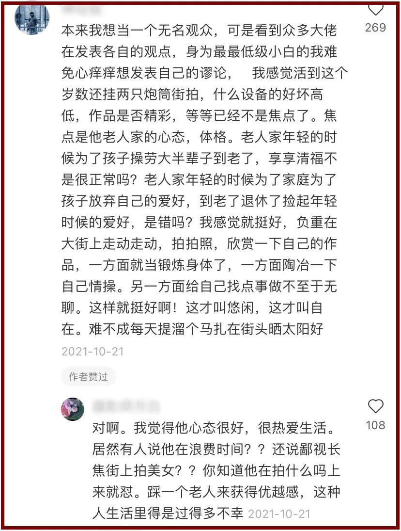 如此说来,老法师常被诟病“无法接受任何负面评价”,其实也不难理解。他们生活就这么点爱好,“疯”一点的,甚至把摄影当做精神信仰,自然容不得半点沙子。这就像无法接受自家偶像被骂的粉丝,无法接受老坛酸菜塌房的吃货。