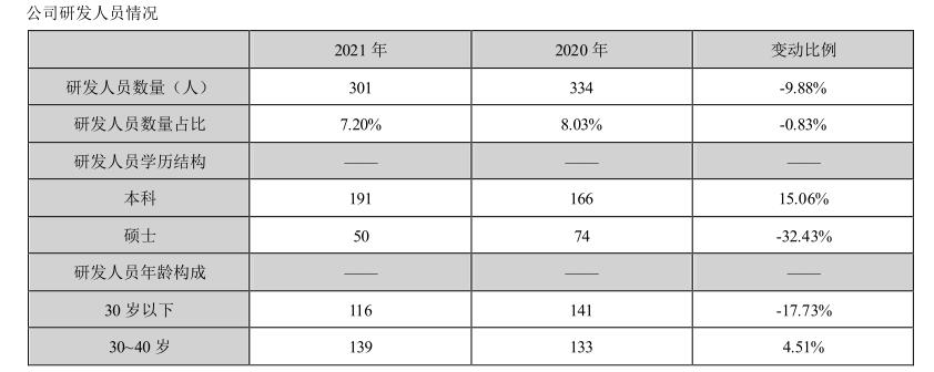 然而,2021年年报却显示,东阿阿胶研发人员数量较2020年减少33人,变动比例接近10%,其中硕士学历、30岁以下研发人员流失最多。相应的,2021年公司研发投入1.48亿元,也比2020年下降3.83%,研发投入占营业收入比例进一步降低。