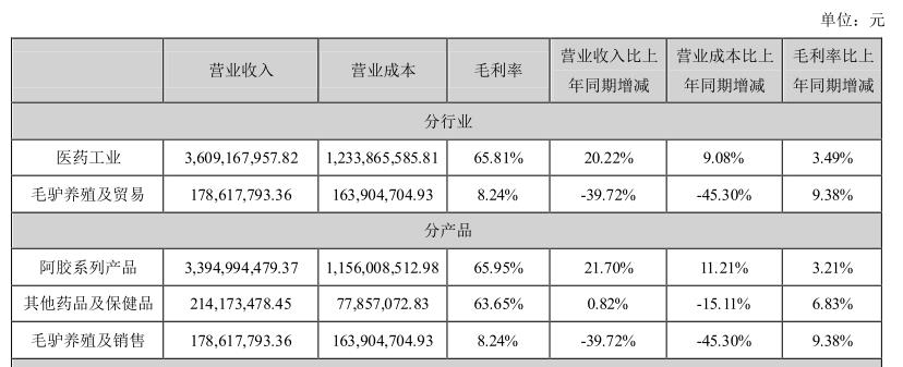 分产品来看,阿胶系列产品2021年全年实现营收33.95亿元,同比增长21.70%;其他药品及保健品2021全年实现营收2.14亿元,同比增长0.82%;毛驴养殖及销售实现营收1.79亿元,同比下滑39.72%。