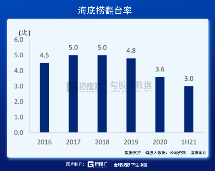 2021年,海底捞餐厅的总体平均翻台率为3.0次/天,同店翻台率为3.5次/天。对比2021年上半年,总体及同店翻台率分别为3.0次/天及3.4次/天,基本持平。