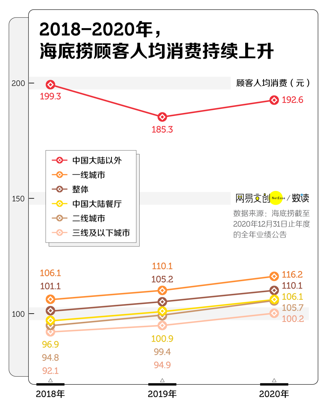 海底捞的业绩公告显示,海底捞整体的顾客人均消费从 2019年的105.2 元上升至 2020 年的 110.1 元,人均消费增加4.9元。