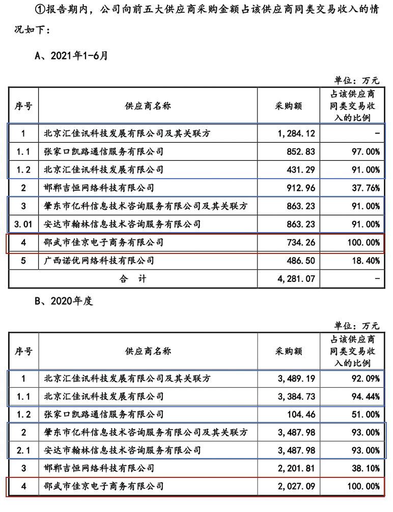 2018年-2021年上半年,在电旗股份的前五大供应商中,多家公司90%以上、甚至100%的销售收入来自电旗股份。