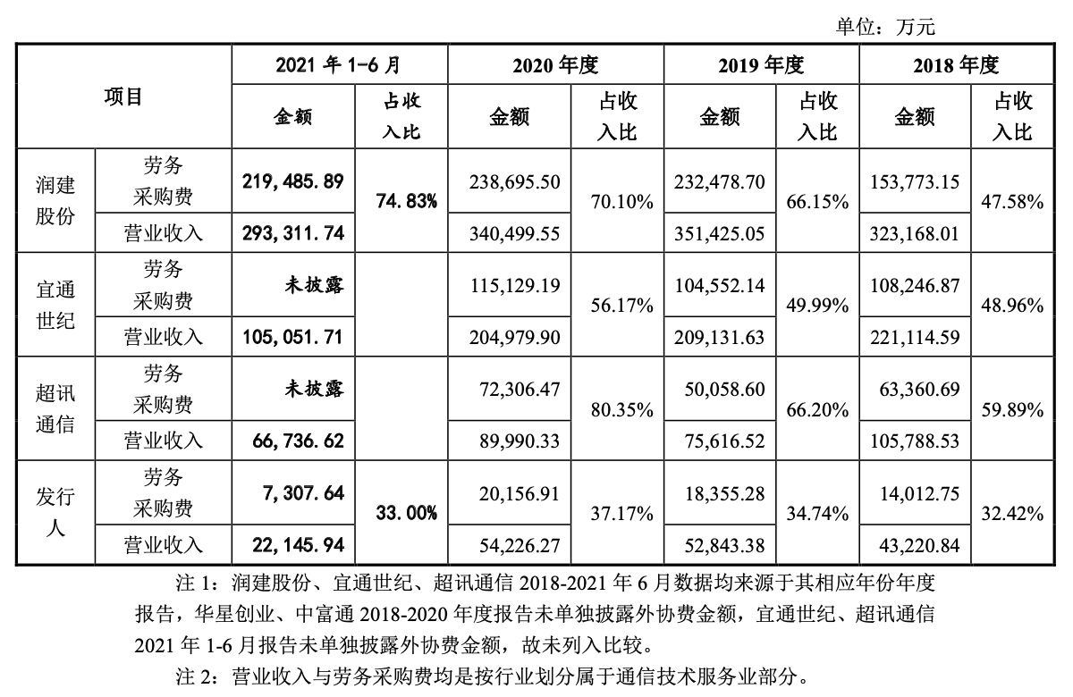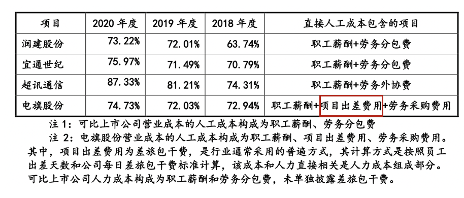 电旗股份解释称,原因在于公司与可比上市公司的主营业务结构存在差异,可比上市公司主要业务为通信网络建设工程服务、网络通信代维服务,建设任务量较大、建设范围较广,包含施工、扩建等基础配套建设服务,通常将通信网络建设、通信网络维护中基站房屋建筑、架线作业、光缆线路敷设与改迁、管道开挖与砌筑、通信设备拆装与搬运、材料等物资的搬运及调拨等劳务作业交由外购劳务人员完成。