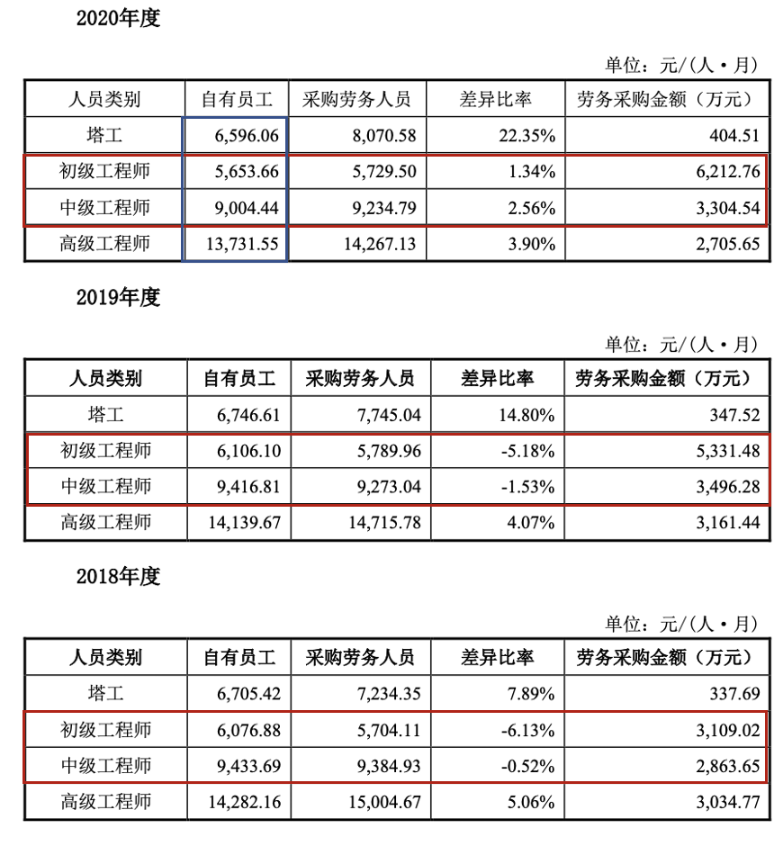 电旗股份解释称,公司劳务采购价格仅考虑工种及技术水平的差异,不考虑采购劳务所属具体项目的情况。公司除了招募部分长期固定的自有塔工外,还会临时采购短期劳务塔工进行补充。外购塔工服务按出勤天数计价,按月结算,单日价格较高,外购塔工服务折算的月均价高于公司自有塔工。而除塔工外,2018年-2020年同等级别的自有员工和劳务人员采购价格不存在重大差异。