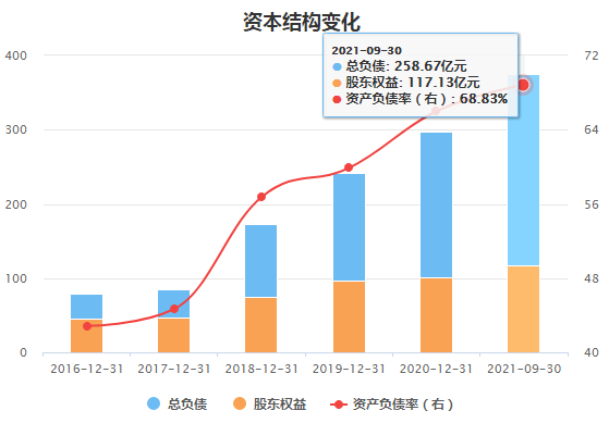 随着相关新项目布局,浙江新能资金压力加剧。最新定增计划中,该公司拟使用9亿元募资补充公司流动资金。财务数据显示,2018年至2020年及2021年前9月,该公司资产负债率分别为56.77%、59.88%、65.99%和68.83%。截至2021年9月30日,该公司总负债258.67亿元,流动负债91.87亿元,包括短期借款26.17亿元、一年内到期的非流动负债23.24亿元、应付账款11.26亿元,货币资金22.7亿元。