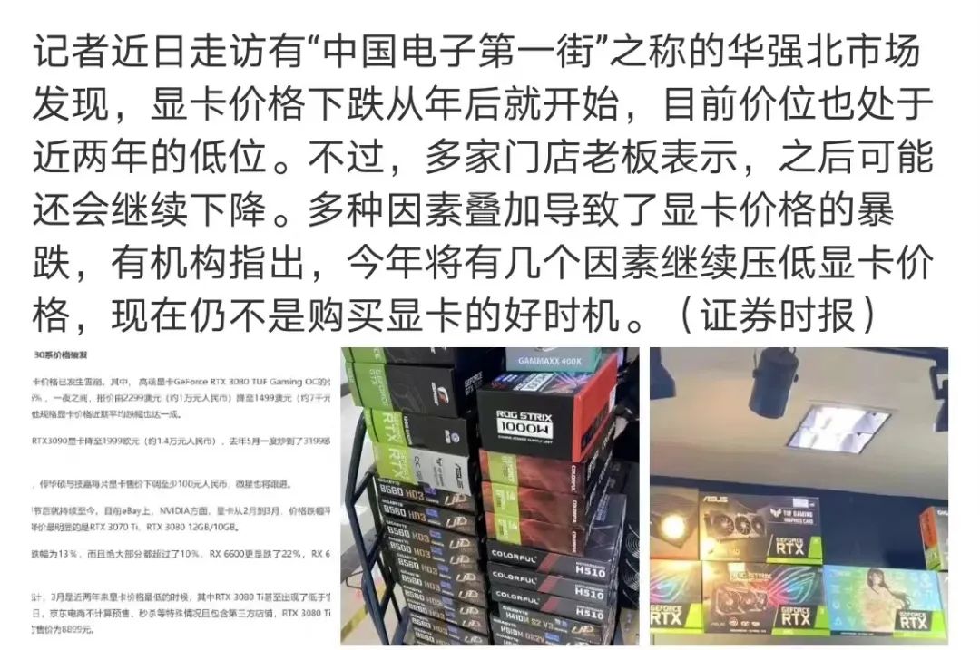 “降价明显,店家称还会继续降。”近日,有媒体走访有“中国电子第一街”之称的华强北市场,发现显卡价格从年后就开始下跌。3月25日,#显卡报价雪崩#的话题也频频登上热搜。