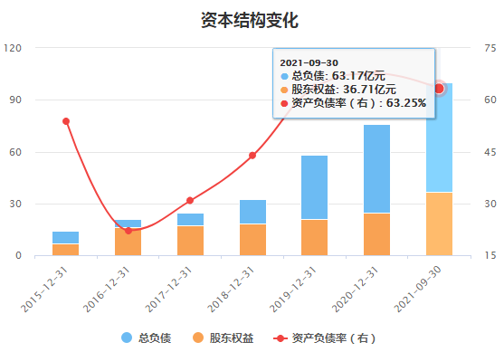 财务数据显示,2019年以来,天能重工的资产负债率便始终在60%以上,截至2019年年末、2020年年末及2021年9月30日分别是63.66%、67.63%、63.25%。截至去年9月底,该公司负债合计约63.17亿元,流动负债约41.6亿元,包含短期借款12亿、应付票据及应付账款22.8亿元,同期的货币资金约为17.96亿元。