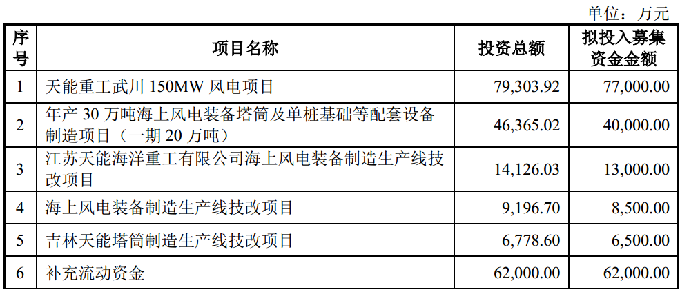 根据2022年3月18日发布的最新定增方案,该公司该轮定增仍针对风电项目。其中,7.7亿元将用于投资武川150MW风电项目;6.8亿元将投资风电装备制造项目,分别涉及年产30万吨海上风电装备塔筒及单桩基础等配套设备制造项目(一期20万吨)、江苏天能海上风电装备制造生产线技改项目、海上风电装备制造生产线技改项目、吉林天能塔筒制造生产线技改项目;另外6.2亿元用于补充流动资金。