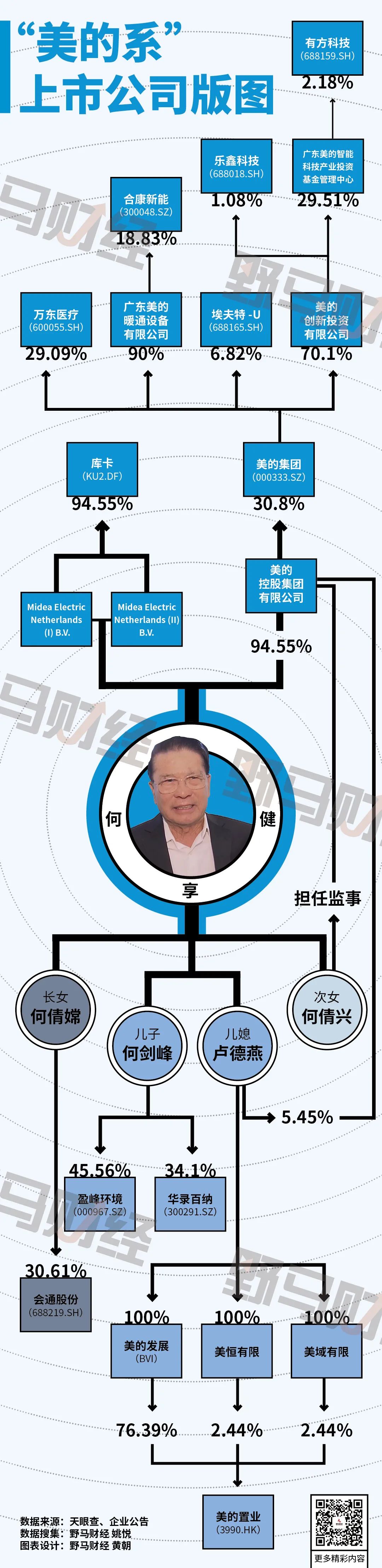 《2021胡润百富榜》中,何享健家族以2130亿元人民币财富位列第9位。何享健的主要财富来源于持有31.07%的美的集团股份。何享健也是美的集团和何氏家族的灵魂人物。曾在何享健遭绑架时,游泳救父的何剑峰,儿媳妇卢德燕、以及何倩嫦、何倩兴两个女儿,则是这个家族的左膀右臂。