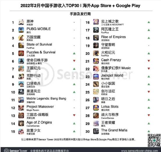 据Sensor Tower平台数据显示,今年2月三七互娱旗下三消+末日题材游戏《Puzzles &Survival》表现抢眼,成功杀入当月国产手游出海收入榜Top 5。另一家厂商麦吉太文面向女性市场的三消+换装产品《Project Makeover》则稳居榜单第12位,公司也凭游戏的出色表现力压乐元素位列2月中国手游发行商收入榜第16位。