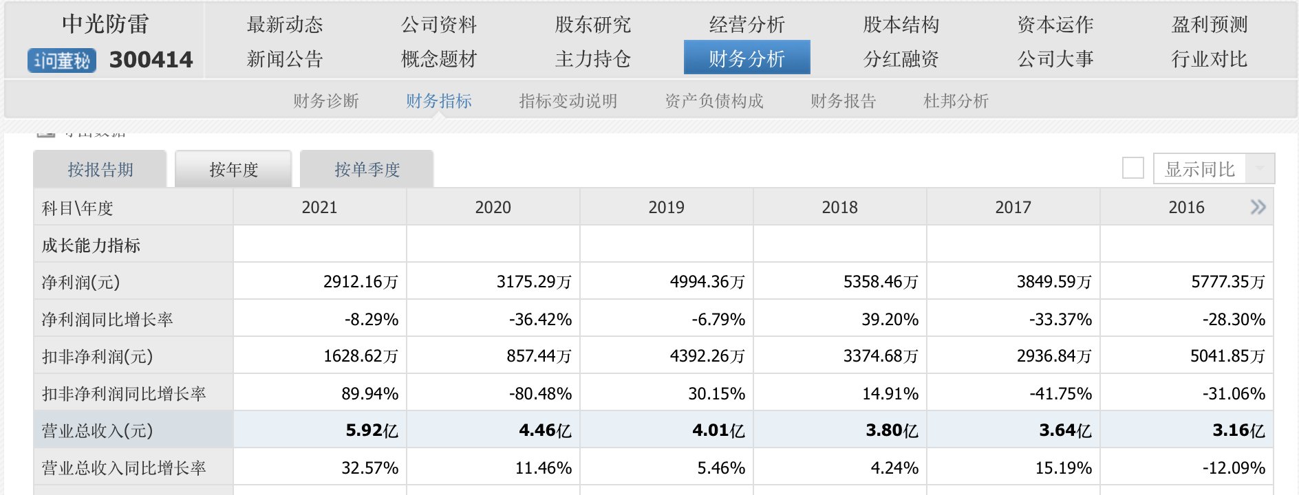 中光防雷(300414.SZ)的2021年营业收入为5.92亿元,同比增幅32.57%,而数据显示,自2015年上市以来,这个营业收入创出了新高。2021年的净利润达2912.16万元,较2020年却没有惊喜,同比下滑了8.29%,但扣非净利润实现1628.62万元,同比增幅达89.94%。