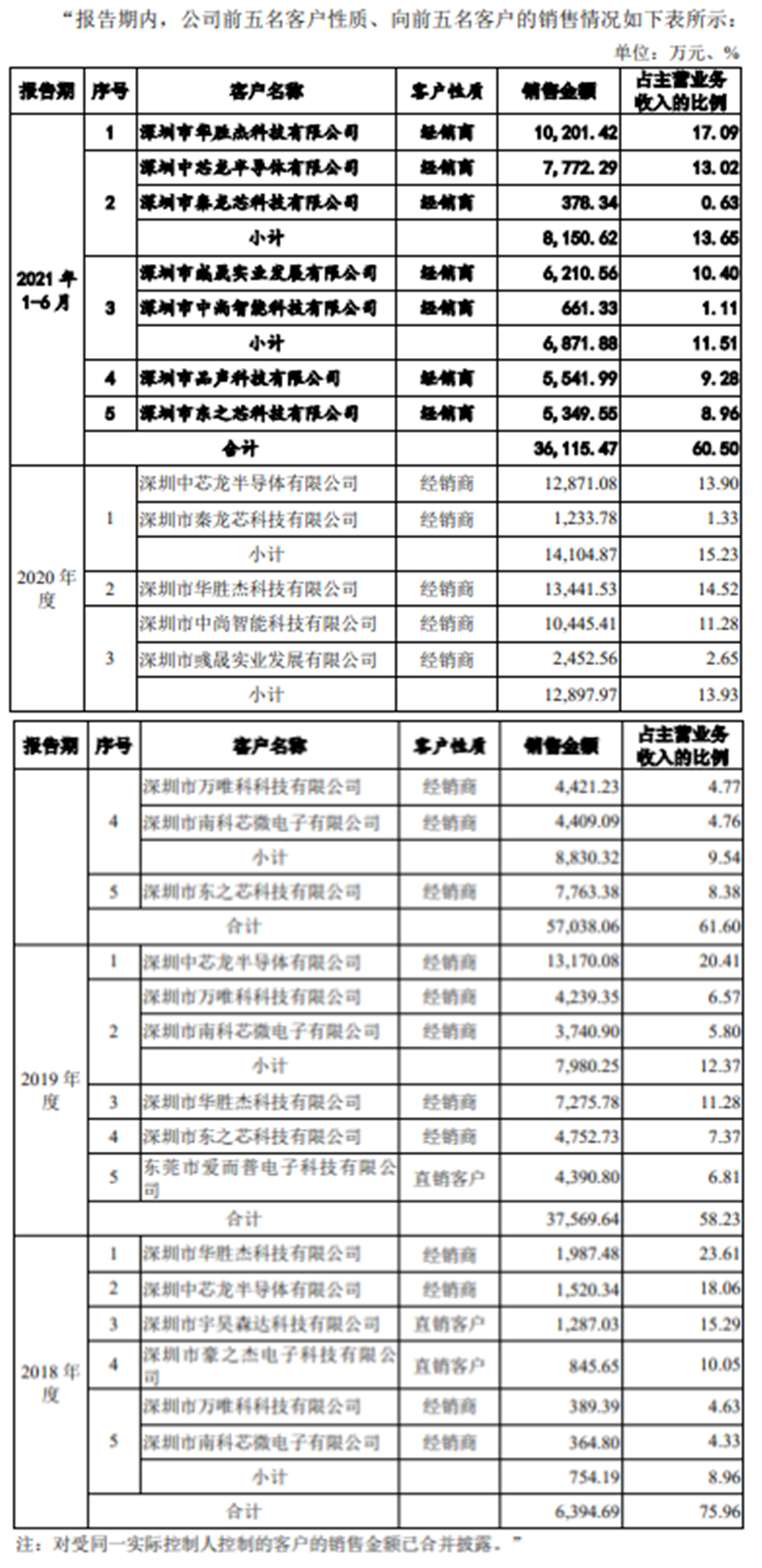 其中2018-2020年公司前五大客户销售金额分别为0.64亿元、3.76亿元及5.7亿元,占比当期主营业务收入分别为75.96%、58.23%和61.6%。中科蓝讯披露的前五大客户名单中,2019年第一大客户为深圳中芯龙半导体有限公司、第二大客户为深圳市万唯科科技有限公司及深圳市南科芯微电子有限公司、第三大客户为深圳华胜杰科技有限公司、第四大客户为深圳市东之芯科技有限公司、第五大客户为爱而普。