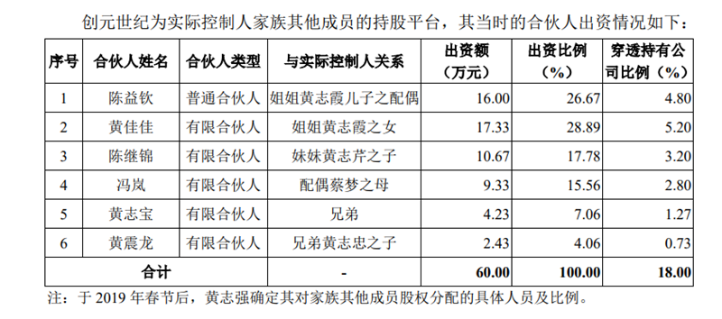 表面上,陈益钦将股权转让给的是创元世纪,但实际上这次股权转让则是转给了多为家族成员。创元世纪是由实际控制人黄志强家族成员组成的投资合伙企业,合伙人分别有黄志强姐姐黄志霞儿子之配偶、黄志强姐姐黄志霞之女、黄志强妹妹黄志芹之子、黄志强配偶蔡梦之母、黄志强的兄弟黄志宝、黄志强兄弟黄志忠之子等。