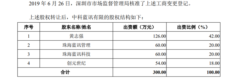 2018年年底,黄志强本人终于出现在股东之位。陈益钦将42%的股份以1万元的价格转让给黄志强后,他成为了中科蓝讯第一大股东持股比例为42%。第二大股东仍为肖曾煌持股40%,陈益钦持股18%。
