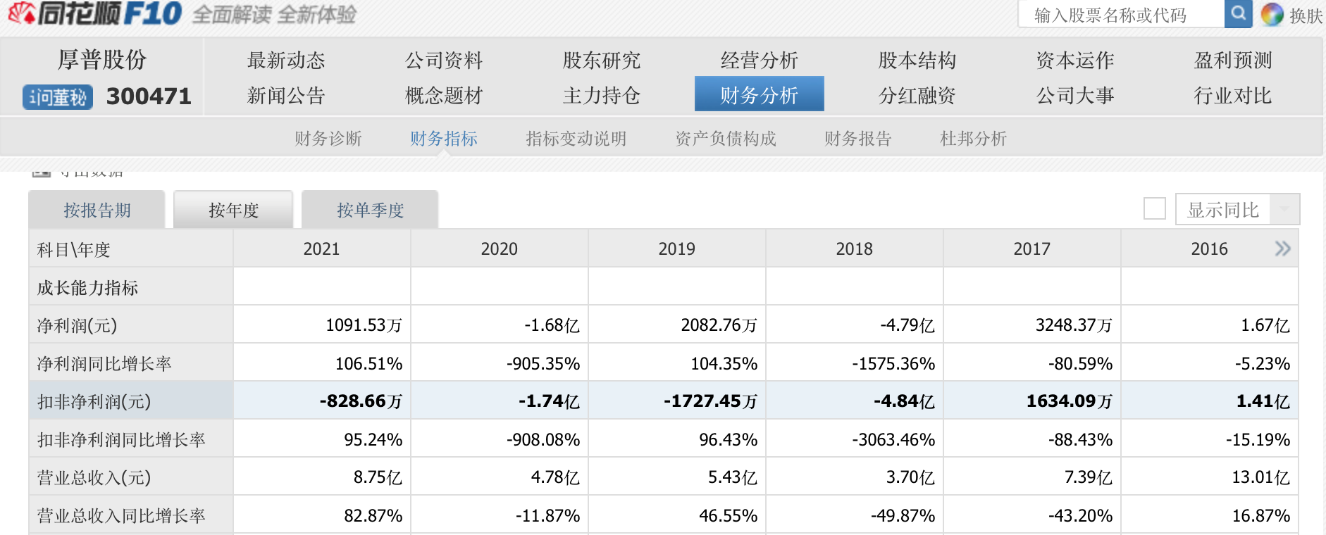 公司2021年年报显示,当年实现营业收入8.75亿元,同比增长82.87%;归属于上市公司股东净利润为1091.53万元,扭亏为盈,2020年该数字还是-1.68亿元;基本每股收益为0.0299元。不过,看扣非净利润的话,厚普股份却已连续4年为负值,2018年至2021年的扣非净利润分别为-4.84亿元、-1727.45万元、-1.74亿元、-828.66万元。在经营活动产生的现金流量净额方面,厚普股份也是连续两年为负值,2020年为-3163.76万元,2021年为-2770.54万元。
