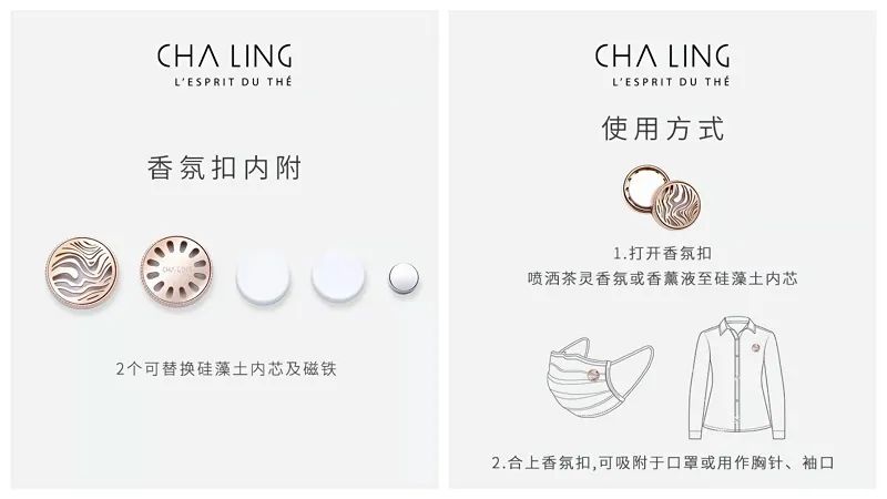 同样十分流行的还有香氛扣,这种产品中有棉片等扩香物,滴入香氛精油后,可以通过自身的磁石吸附在其他物品上。如电子设备品牌Bone推出了精油香氛磁扣;珠宝品牌FloJewllery的香氛扣中的扩香石可以清洗后再次使用;美妆品牌茶灵的香氛扣带有可替换硅藻土内芯。
