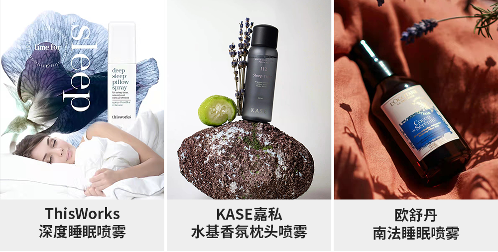 以香氛喷雾来说,一般的产品功能聚焦在香体和除臭上,但随着疗愈向香氛产品越来越盛行,不少品牌推出了具备舒缓、疗愈需求的香氛喷雾。例如针对助眠需求,Thisworks推出深度睡眠喷雾,利用薰衣草油、岩兰草油、广藿香油等帮助消费者安神入眠;欧舒丹推出的南法睡眠喷雾,含有薰衣草精油,混入橘子香气,具有疗愈助眠功效;KASE推出2款不同香型的香氛睡眠喷雾,具有宁神助眠、舒缓身心的功效。
