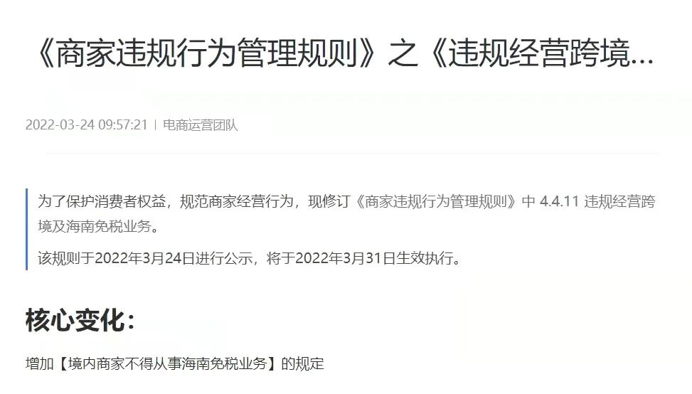 3月24日,抖音电商发布了《商家违规行为管理规则》之《违规经营跨境及海南免税业务》更新公示通知,其中核心变化是增加了“境内商家不得从事海南免税业务”的规定。