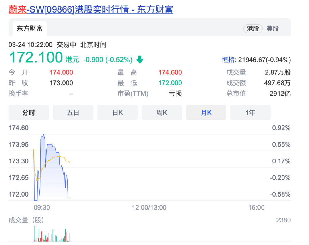 2022年2月28日,蔚来集团在港交所公告称,已向香港联交所上市委员会申请以介绍方式上市,联席保荐人为摩根士丹利、瑞信、中金公司。3月10日,蔚来(09866.HK)开盘价为160港元/股。开盘后,蔚来股价一度涨近6%,但随后一路走低,截至收盘,跌0.69%,报158.9港元/股。