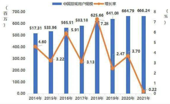再看中国游戏用户规模及增长率的指标:2021年中国游戏用户规模达6.66亿人,增速仅较2020年增加了0.22%。
