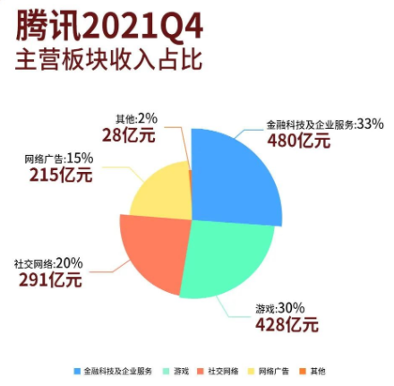 数据显示,腾讯2021年Q4的营收共计1441.88亿元。其中,金融科技及企业服务板块收入 479.58亿元,同比增长25%,占总营收比重33%;而一直视为“现金牛”的网络游戏收入为428亿元,同比增长9%,占总营收比重29.7%,低于前者。