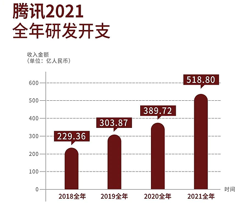 诚然,近年来腾讯不断加大数字化投入、夯实数字化技术底层能力。数据显示,2021年腾讯研发投入增加33%,达到518.8亿元,相比2018年的229.36亿元,已然翻倍!