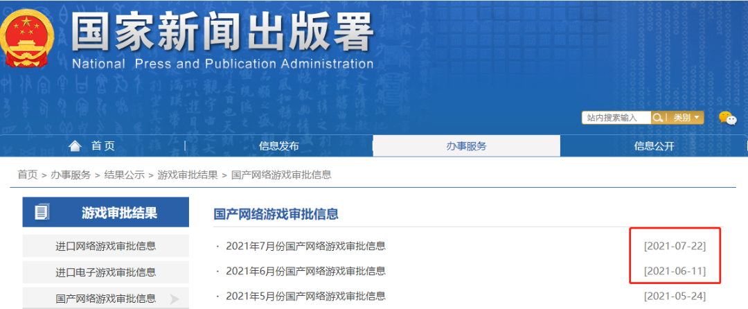 其一,据国家新闻出版署公开信息显示,2021年7月至今网络游戏审批信息再未更新,这标志着国产网络游戏正遭遇着严峻的政策监管的寒冬。