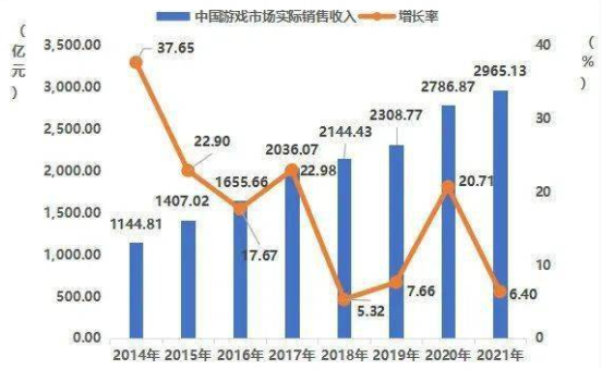 中国音数协游戏工委 (GPC) 与中国游戏产业研究院发布了《2021年中国游戏产业报告 》,其数据服务由伽马数据提供。数据显示,2021年中国游戏市场实际销售收入2965.13亿元,仍保持增长态势,但增幅较去年同比缩减近15%。