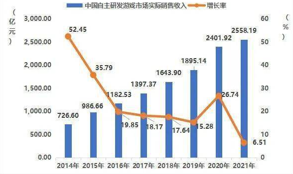 再看一个数据,报告显示:2021年中国自主研发游戏实际销售收2558.19亿元,比2020年同比增长了6.51%,但增幅较去年同比缩减近20%!