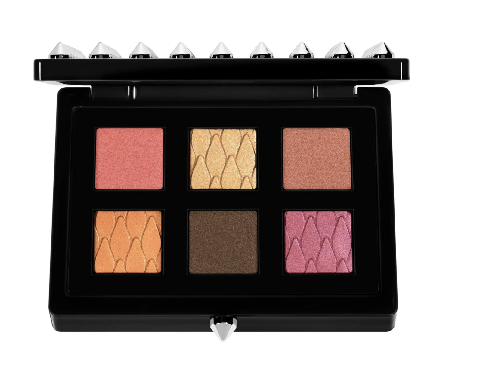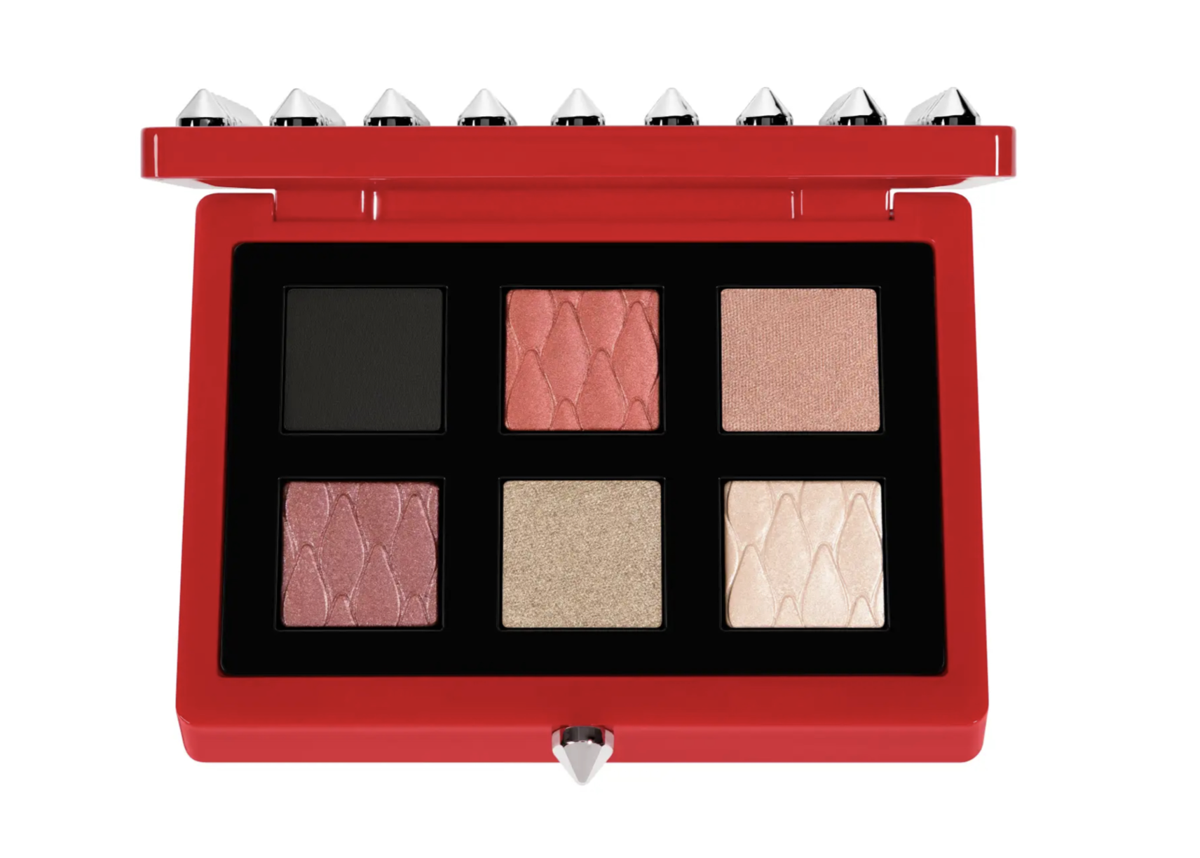 系列彩妆均“穿着”排列整齐的柳钉外衣,铆钉元素银色闪亮,黑色外壳摇滚时髦;红色外壳具有先锋时尚感,展现出一种个性与态度的表达,也能看出铆钉元素正朝着更多元化的方向发展。六款彩妆盘均经过精心挑选,色彩鲜艳大胆且质地丝滑,不论是哑光、缎面、微闪,还是金属质感,一应俱全。