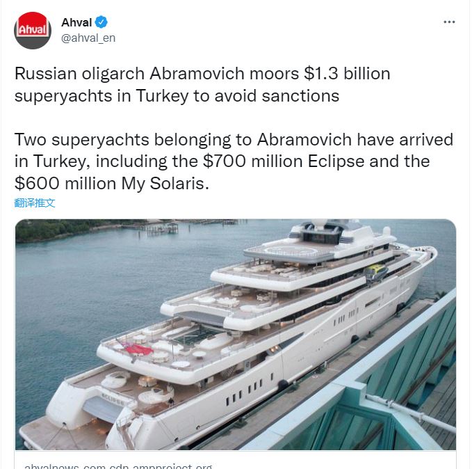 上周末,土耳其外长查武什奥卢向遭受西方制裁的俄罗斯寡头喊话,称土耳其欢迎这些俄罗斯大亨作为投资者和游客前往土耳其。上周,据称属于俄罗斯亿万富豪阿布拉莫维奇的两艘超级游艇抵达土耳其。