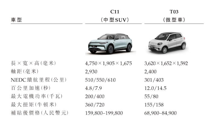 三款车中S01的定价不超过15万元,T03则更便宜,定价在6-9万元范围内,只有C11的定价在15-20万元,也位于15-30万区间的较低值。
