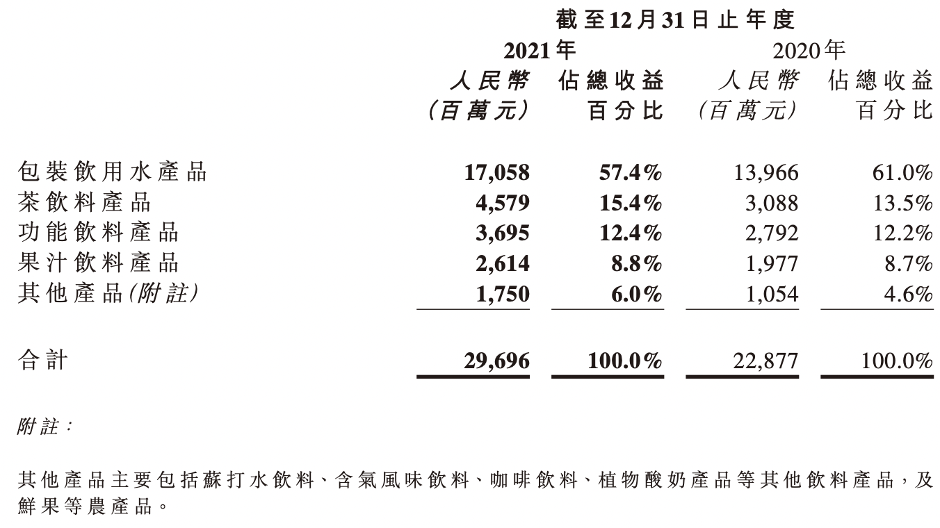 包括苏打水、含气饮料、咖啡等产品在内的其他产品,尽管增速在66%,但在农夫山泉总收益中占比仅为6%,换算下来仅不到18亿元,其中含气饮料以去年颇为出圈的气泡水为主。