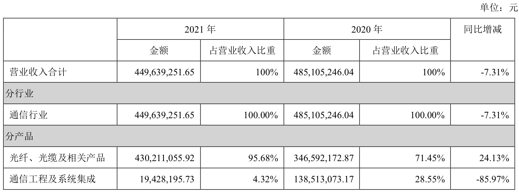 数据上,汇源通信光纤光缆及相关产品业务营业收入4.3亿元,占营业收入95.68%,与上年同期相比上升24.13%;而通信工程及系统集成业务营业收入1942.82万元,占营业收入的4.32%,与上年同期相比下降85.97%,主要原因系2020年第四季度公司出售了主营通信工程及系统集成业务的控股子公司四川汇源吉迅数码科技有限公司。