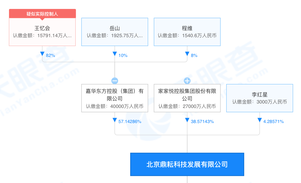 天眼查显示,鼎耘科技成立于2018年1月29日,法定代表人李红星,注册资本7亿元,实缴资本2.7亿元,参保人数4人。鼎耘科技有3位股东,嘉华东方控股(集团)有限公司持有57.14%的股份,家家悦控股集团股份有限公司持股38.57%,李红星持有4.29%。家家悦控股集团股份有限公司旗下还有家家悦(603708.SH)这个上市公司平台,而嘉华东方控股(集团)有限公司也是万通发展(600246.SH)的控股股东。