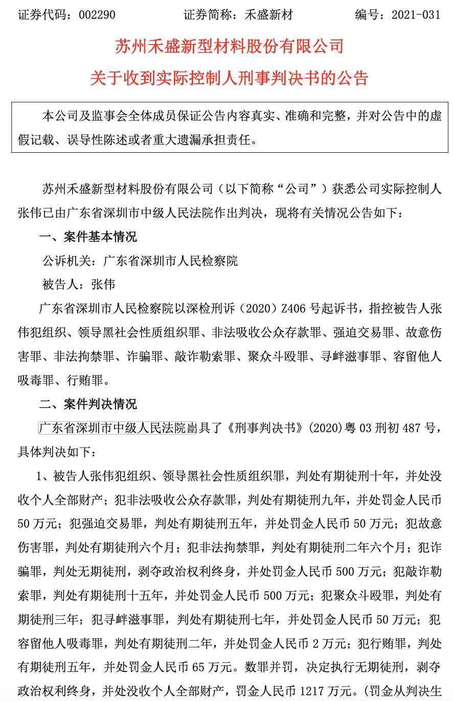2021年6月1日,禾盛新材发布《关于收到实际控制人刑事判决书的公告》,禾盛新材实际控制人张伟已由广东省深圳市中级人民法院作出判决:数罪并罚,决定执行无期徒刑,剥夺政治权利终身,并处没收个人全部财产,罚金1217万元。