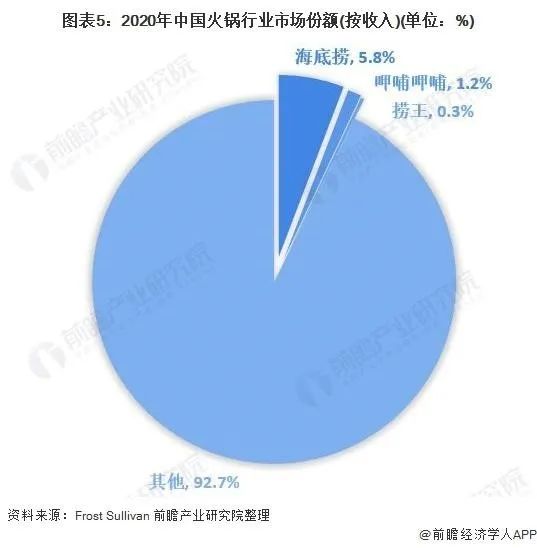 沙利文数据显示,2020年,中国火锅行业CR3仅为7.3%,CR5仅为7.9%。海底捞虽然是中国火锅行业的龙头企业,但2020年市场份额仅为5.8%,排名第二的呷哺呷哺市场份额仅为1.2%。