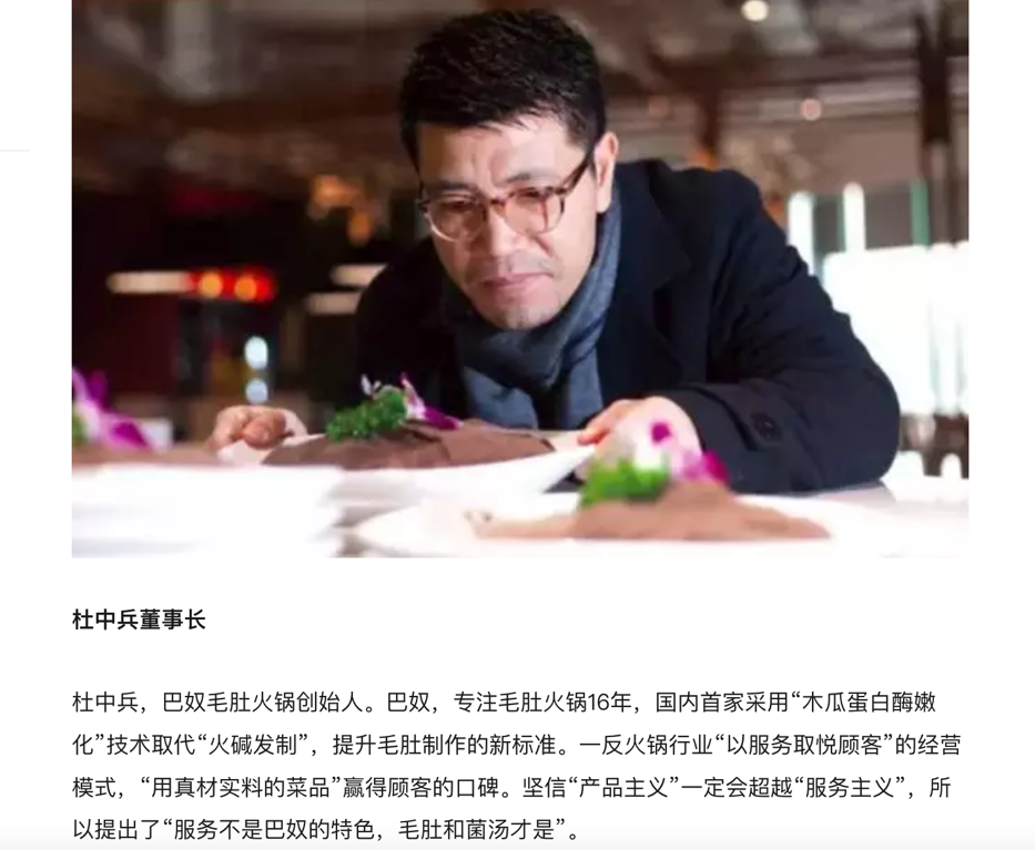 有不少文章的描述里,巴奴又变成了国内第一家采用“木瓜蛋白酶技术” 嫩化毛肚火锅品牌。而在某些自媒体的故事中,杜中兵甚至被写成了这项技术的发明人之一。