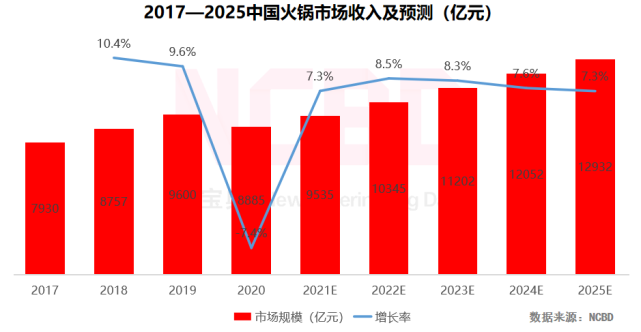 餐饮大数据研究与测评机构NCBD发布的《2021—2022中国火锅行业发展报告》显示,2021年,中国火锅市场规模预计为9535亿,而2022年这一数字将突破1万亿元,到2025年预计将接近1.3万亿元,年均增速保持在7%左右。